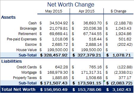 As of May 31, 2015, my net worth went up by $3,162.43, to a total of $156,950.49. A $1,000 contribution to brokerage, additional principal payment to the mortgage of $2,000, and general investment gains all helped. This was offset by high expenses in trips and entertainment, and payment to credit cards from the previous month reduced cash reserves.