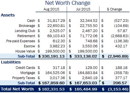 As of Aug 31, 2015, my net worth went down by $3,153.46, to a total of $162,331.53.  The primary reason was a decrease overall in the stock market.  But an increase in expenses (bought a new kitchen table and spent over $500 in home maintenance-related purchases) also contributed.