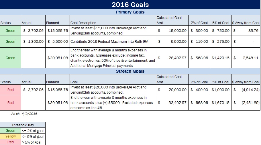 Remember to keep track of progress on the status on the 2016 Goals Tracker Page.