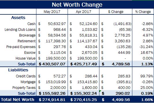 At the end of May, my net worth went up by about 1.6%, to end at $274,914.81. Cash is starting to come down, which is a trend that will continue for the remainder of 2017 since I continue to put a significant amount of money towards investments. This will get me closer to having enough cash to cover an 8 month emergency fund, as opposed to a year’s worth which is what it’s at now.