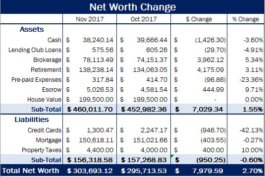 At the end of November, my net worth went up by 2.7%, to end at $303,693.12 which is an increase of just under $8,000 from last month. Market gains and low expenses contributed to the increase in net worth. This also marks a milestone of net worth crossing the $300,000 amount!