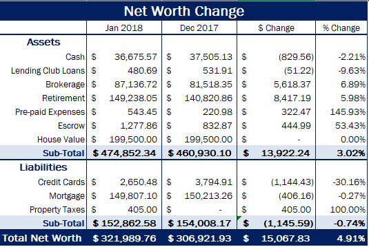 At the end of the first full month of 2018, my net worth went up by 4.91%, to end at $321,989 which is an increase of just over $15,000 from last month! Market gains are the primary contributor to this.
