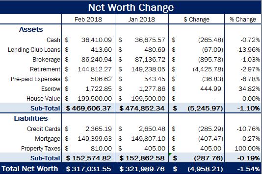 At the end of the February, 2018 my net worth went down by 1.5%, to end at $317,031 which is a decrease of just under $5,000 from last month.  Extreme market volatility are the primary reason my net worth decreased for only the second time in years.