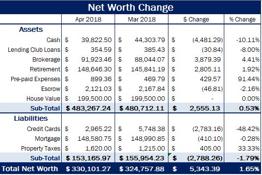 At the end of the April, 2018 my net worth went up by 1.65%, to end at $330,101 which is increase of about $5,300 from last month. While cash took a hit to pay down the balance due of some credit cards, liabilities as a result went down and the market wasn’t as volatile as previous months.