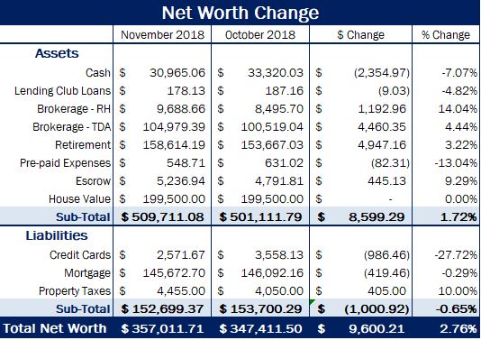 November recovered some of October’s losses, up 2.7% or $9,600 to finish at $357,000.  Market gains for the month are the primary reason for this.