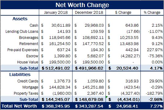 January recovered most of December’s losses, up 7.27% (almost $25,000) to finish at $368,245. Market recovery is the primary reason. You’ll note there’s a negative balance to Property Taxes, due to a payment out of my bank account for reasons that’s for another post. Escrow company then paid the full property taxes due, not the net balance after my payment. Result is a negative property tax balance. Without the over payment, cash would be about $2,300 higher.