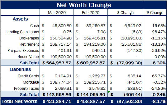 In March, net worth was down significantly (again) due to market declines over Covid-19. Net worth dropped an additional (8.17%) down a record ($37,500) from February. Net worth is now at $421,384, which is the lowest since May, 2019.