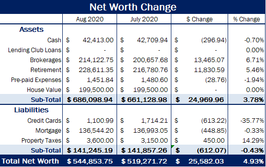 In August, net worth increased for the 4th straight month, mostly due to stock market gains. Net worth went up by 4.93% to end at $544,853, an increase of about $25,500.