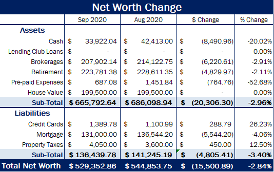 In September, net worth went down after 4 months of gains, again mostly due to stock market volatility. Net worth went down by 2.84% to end at $529,352, or down about $15,500.