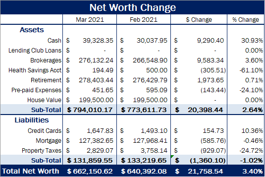 In March I saw another 3% / $20,000 net worth gain to bring me to a total of $662,150. This was primarily due to a company bonus and stock market gains.