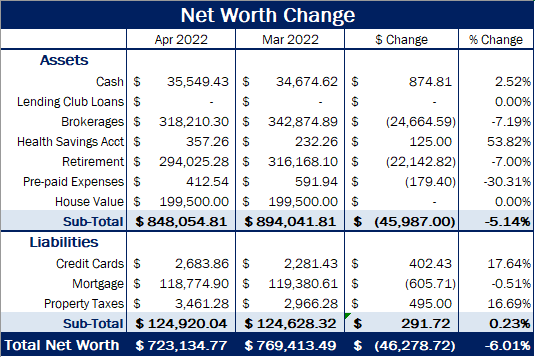 In April, the stock market continued its downward trend after a month of salvation, leading my net worth to decline by about $46,000 to end at $723,134.77.