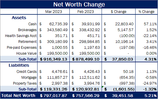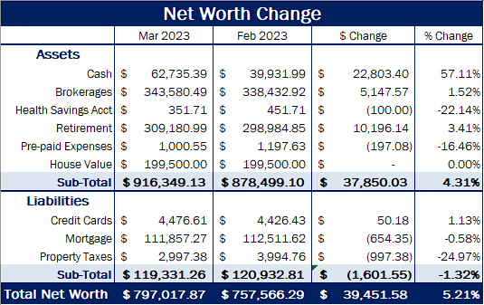March was company bonus month, helping net worth increase by almost $40,000 to a total of $797,017.87.