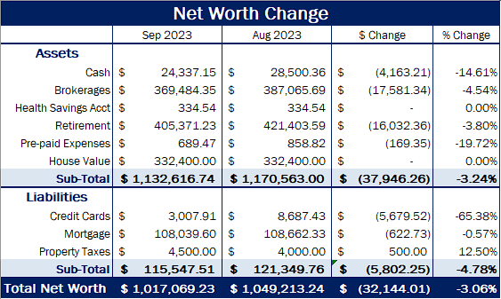 In September, my net worth decreased by about $32,000 to bring me to a total of $1,017,069.23.