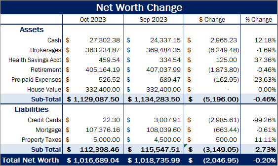 In October, my net worth decreased again by about $2,000 to bring me to a total of $1,016,689.04.