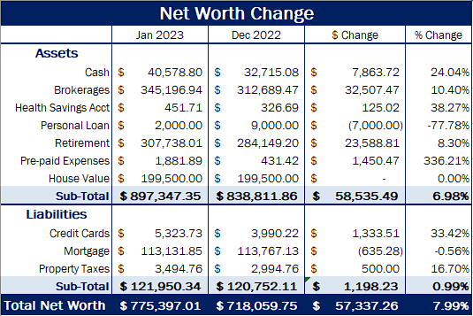 2023 has started strong with my net worth increasing nearly 8% ($57,000) to a total of $775,0397. This is due to strong gains in the stock market.